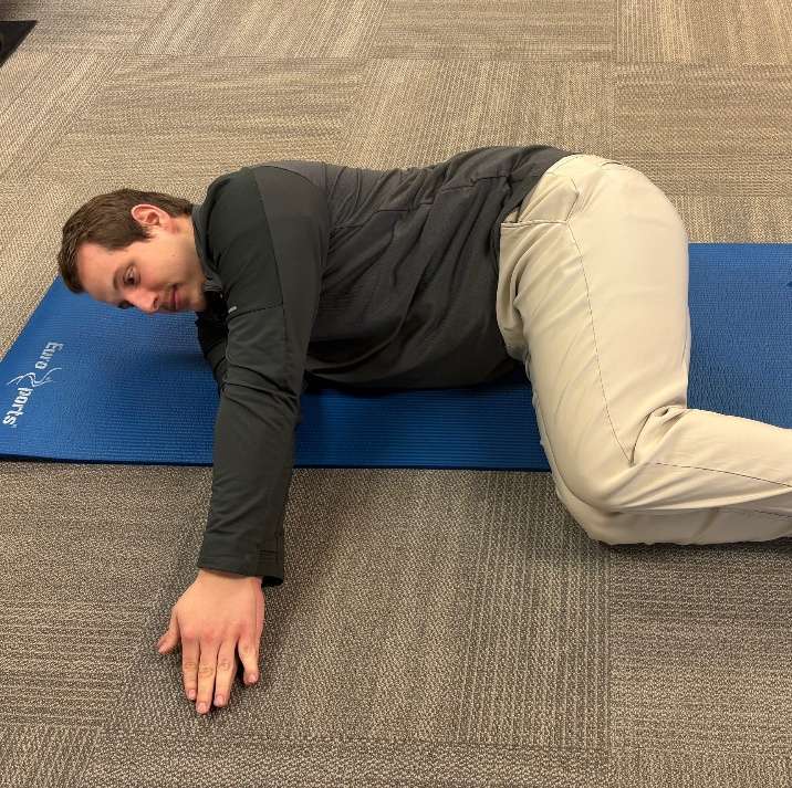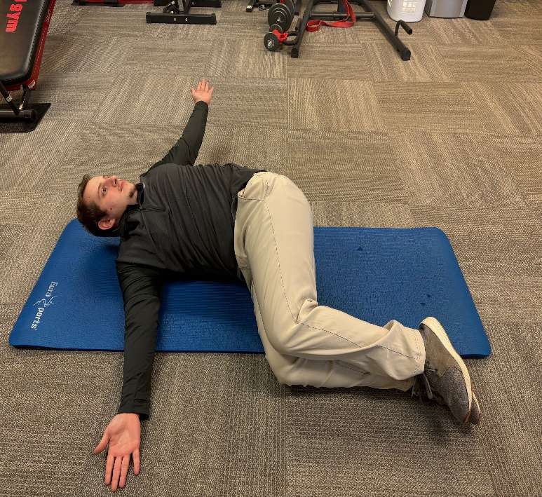 The side-lying open book is a great way to target thoracic spine mobility by increasing thoracic spine rotation. It is also an exercise that can be completed at home without any equipment, all you need is something to lay on. The steps for the exercise are as follows: