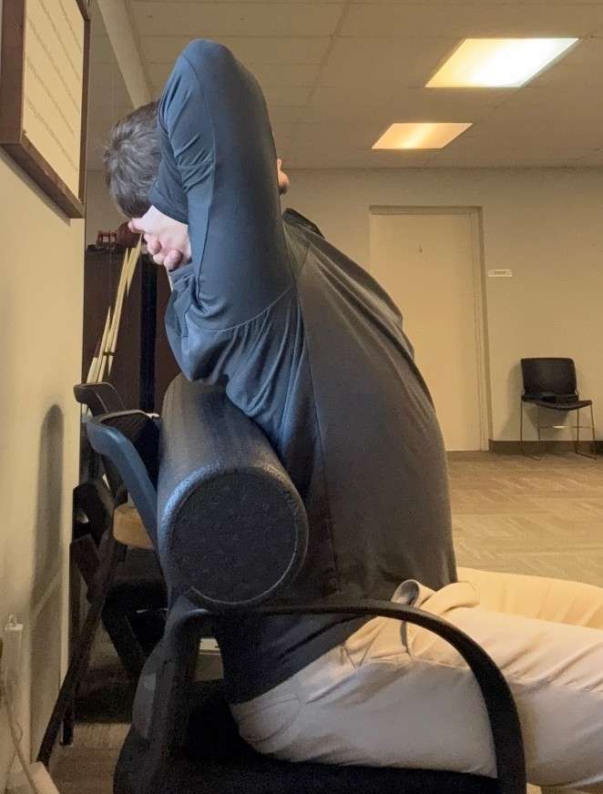 • Place a foam roller across the back of a chair in line with the middle of your back or with you laying onto your back.
