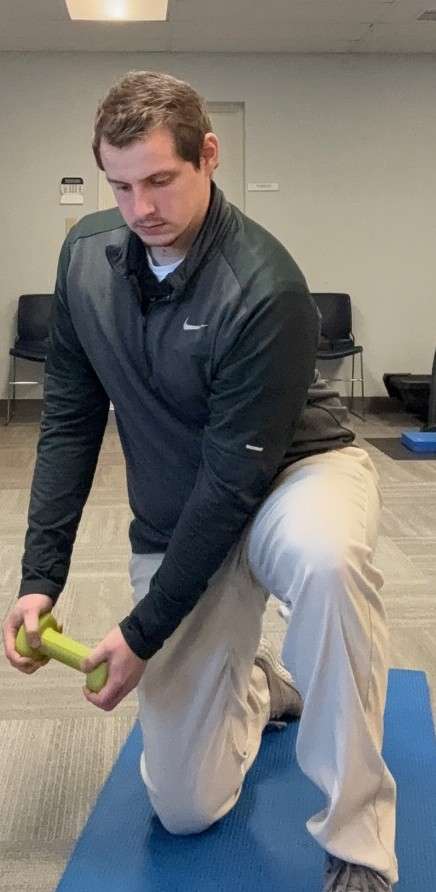 This exercise is to help address the muscular control portion of the thoracic spine during the swing that we discussed earlier. The half kneeling rotation is a strength building exercise for your core and the muscles in your back. Going slow with proper form is essential in this exercise to avoid injury. Also, begin with light weight or no weight until you feel comfortable with the form for this exercise. The instructions are as follows: