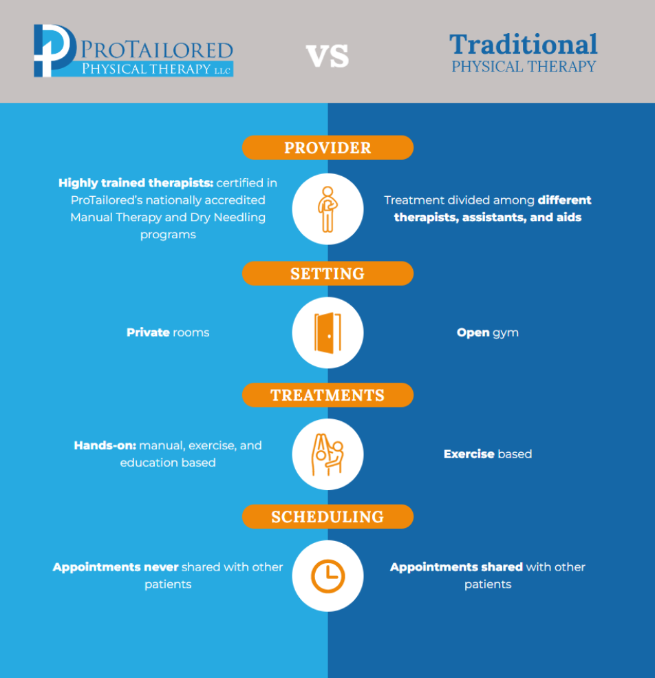 In order to do this, we have intentionally structured our clinic and treatment sessions in a way that allow for this more individualized type of care; care that is designed to fully focus on you, our patient. These defining features that distinguish us from the traditional physical therapy setting and treatment are what we refer to as The ProTailored Difference. The ProTailored Difference is a combination of our four unique qualities that make ProTailored, ProTailored. The ProTailored Difference creates the perfect environment for you to optimize your recovery while being listened to, valued, and known. Come see us at one of our physical therapy clinics in North Fort Wayne, Northwest Fort Wayne, Central Fort Wayne, Southwest Fort Wayne or East Fort Wayne, IN today for the ProTailored Physical Therapy Difference!
