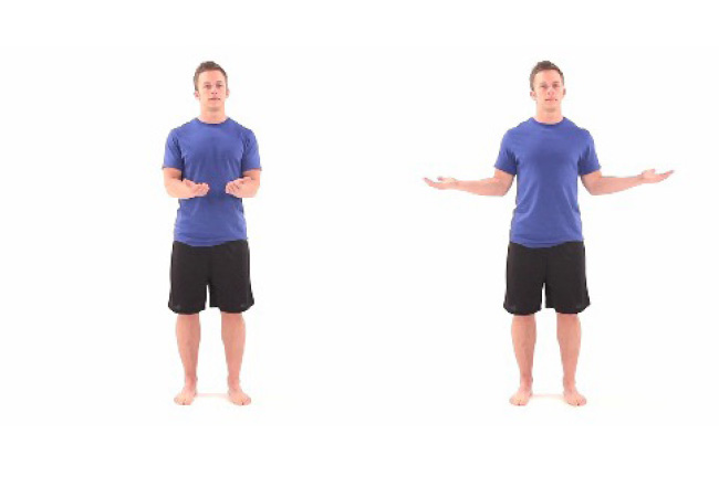 Begin in an upright standing position with your arms by your sides. Bend your elbows to approximately 90 degrees with your palms up.